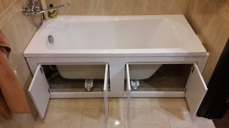 Двери у экранов раздвижные по типу шкафа-купе, напольный тип монтажа. Ножки регулируются до необходимой высоты. Экран подойдет под любую прямую ванну.