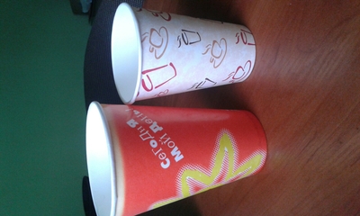 Стакан питьевой- изготовлен из первичного сырья(пищевого картона), ламинированный тончайшим слоем полиэтилена, который изолирует бумагу от попадания влаги и размокания. Формат 110-130мл-0,30грн; 250-300мл-0,60;400-500мл-1,30.
